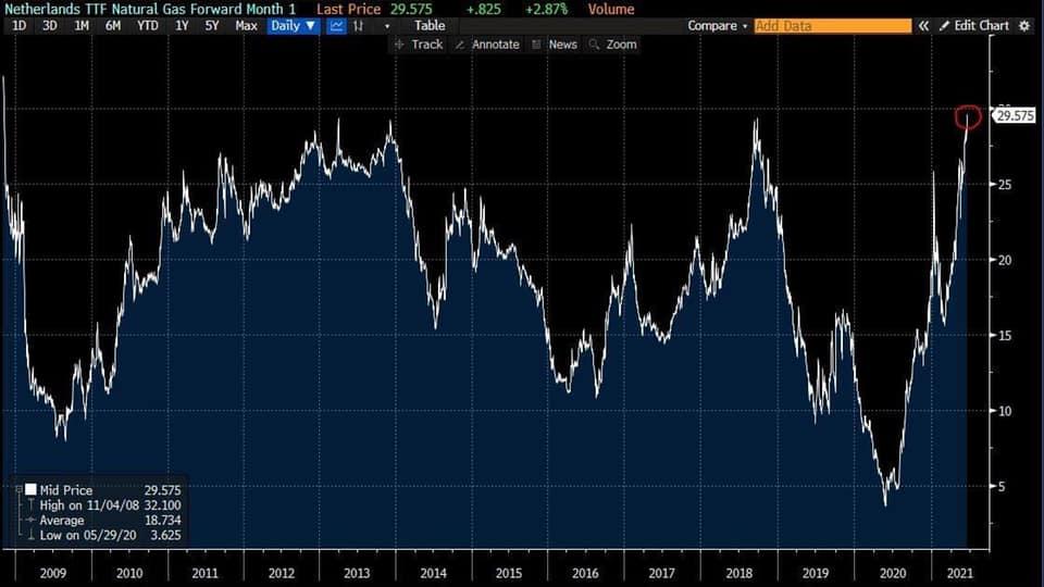 "Стоимость газа на европейском хабе TTF достигла 13-летнего максимума. Рост почти в 6 раз с лета прошлого года", - написал он.