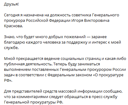 Бывший "прокурор Крыма" Наталья Поклонская, которую президент РФ Владимир Путин уволил с поста замглавы Россотрудничества, заявила, что она назначена на должность советника генерального прокурора России. Об этом она сообщила в Telegram.