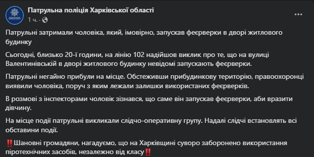 Полиция напоминает, что в Харьковской области строго запрещено использование пиротехнических средств, независимо от класса.