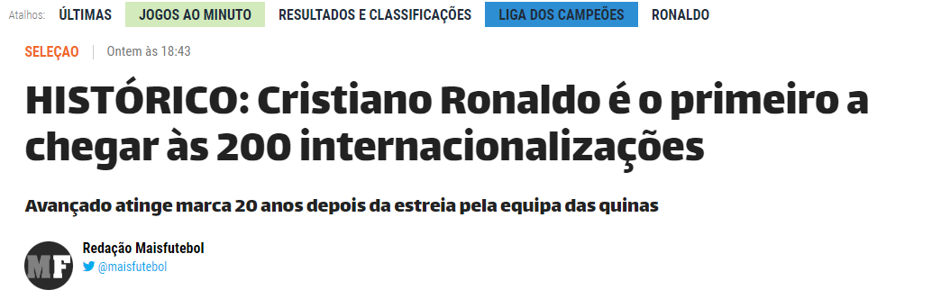 В этом матче гол и матч стали особенными для Роналду. Пятикратный обладатель "Золотого мяча" первым в истории вышел на рубеж в 200 поединков в футболке национальной команды. Кроме того, он закрепился в лидерах списка бомбардиров Португалии всех времен (123 мяча).
