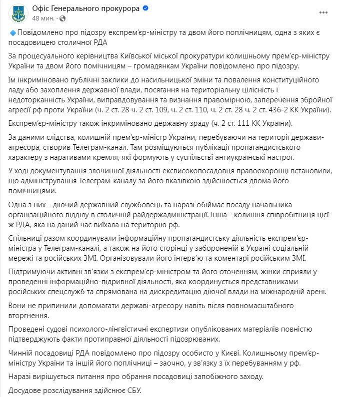 "Им инкриминированы публичные призывы к насильственному изменению и свержению конституционного строя или захвату государственной власти, посягательство на территориальную целостность и неприкосновенность Украины, оправдание и признание правомерной, отрицание вооруженной агрессии РФ против Украины (ч. 2 ст. 28 ч. 9 ст. 2 статьи 110, ч. 2 статьи 28 ч. 2 статьи 436-2 УК Украины). Экс-премьер-министру также инкриминируется государственная измена (ч. 2 ст. 111 УК Украины)", - сказано в посте.