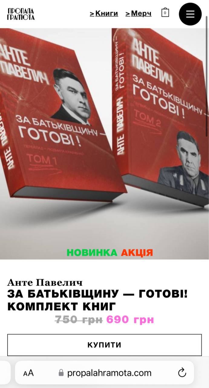В сети книжных магазинов "Книгарня Є" после скандала заявили "Стране", что мемуаров хорватского фашиста, союзника Гитлера Анте Павелича у них в наличии нет - ни в онлайне, ни в физическом магазине.