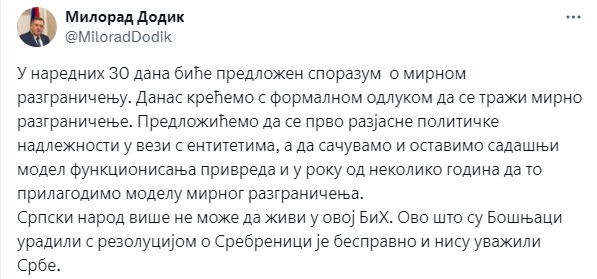"В ближайшие 30 дней будет предложено соглашение о мирной демаркации. Сегодня мы начинаем с официального решения добиваться мирной демаркации. Мы предложим сначала уточнить политические компетенции в отношении субъектов, а также сохранить и оставить нынешнюю модель функционирования экономики и в течение нескольких лет адаптировать ее к модели мирного разграничения. Сербский народ больше не может жить в в такой Боснии и Герцеговине", - сказано в публикации.