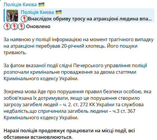 Между тем поисково-спасательные работы после обрыва троса на аттракционе в Киеве продолжаются уже третий час, на данный момент тело погибшего парня все еще не нашли.