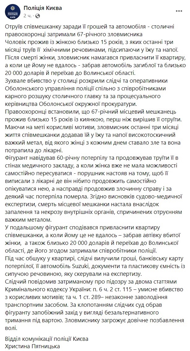 Правоохранители установили, что 67-летний местный житель прожил около 15 лет с киевлянкой, прежде чем решил ее отравить.