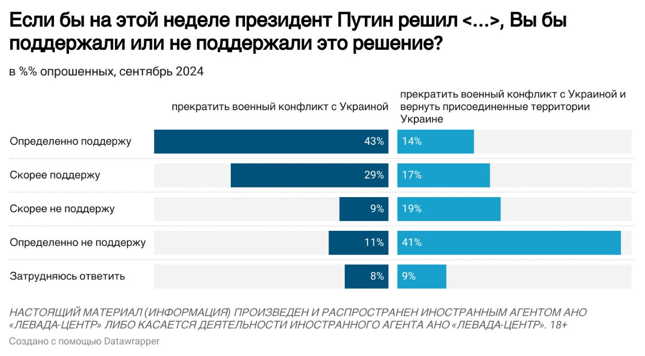 Также 72% поддержали бы Владимира Путина, если бы он решил прекратить войну с Украиной уже на этой неделе (20% не поддержали бы). Но только 31% поддержал бы мир ценой возврата Украине ее территорий (60% не поддержали бы).