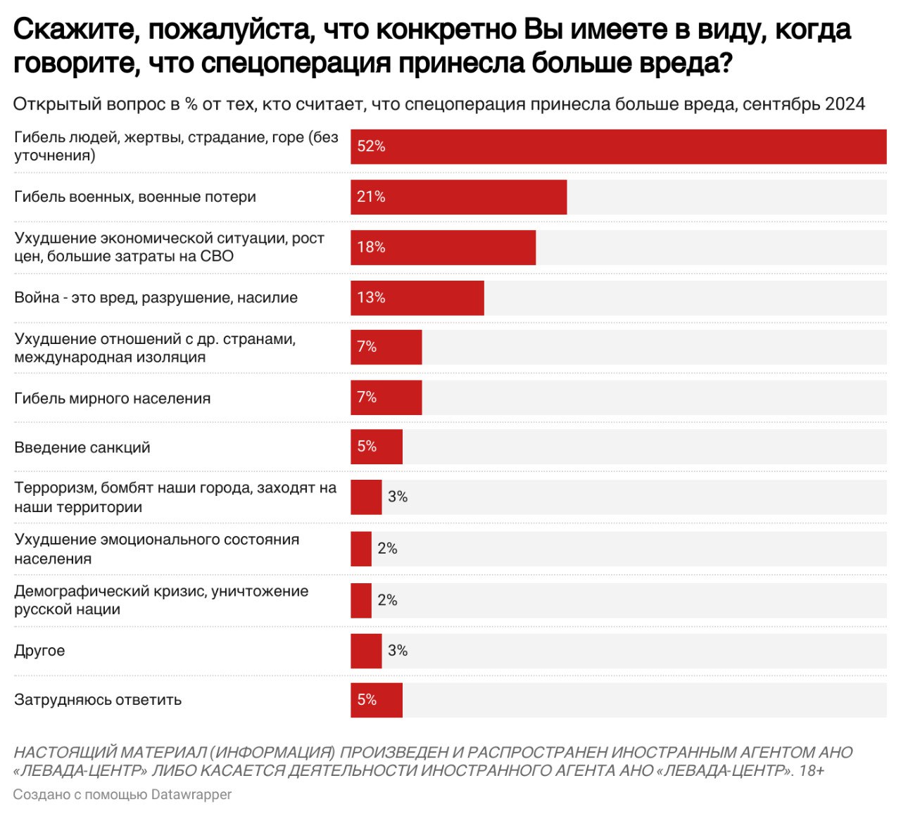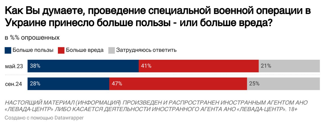 При этом 47% считают, что война в Украине приносит больше вреда, чем пользы, у 28% обратное мнение (в мае 2023-го эти цифры были соответственно 41% и 38%).