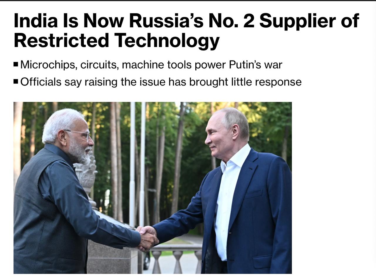 Индия стала вторым по величине поставщиком критически важных технологий в Россию. Об этом пишет Bloomberg со ссылкой на американских и европейских чиновников.