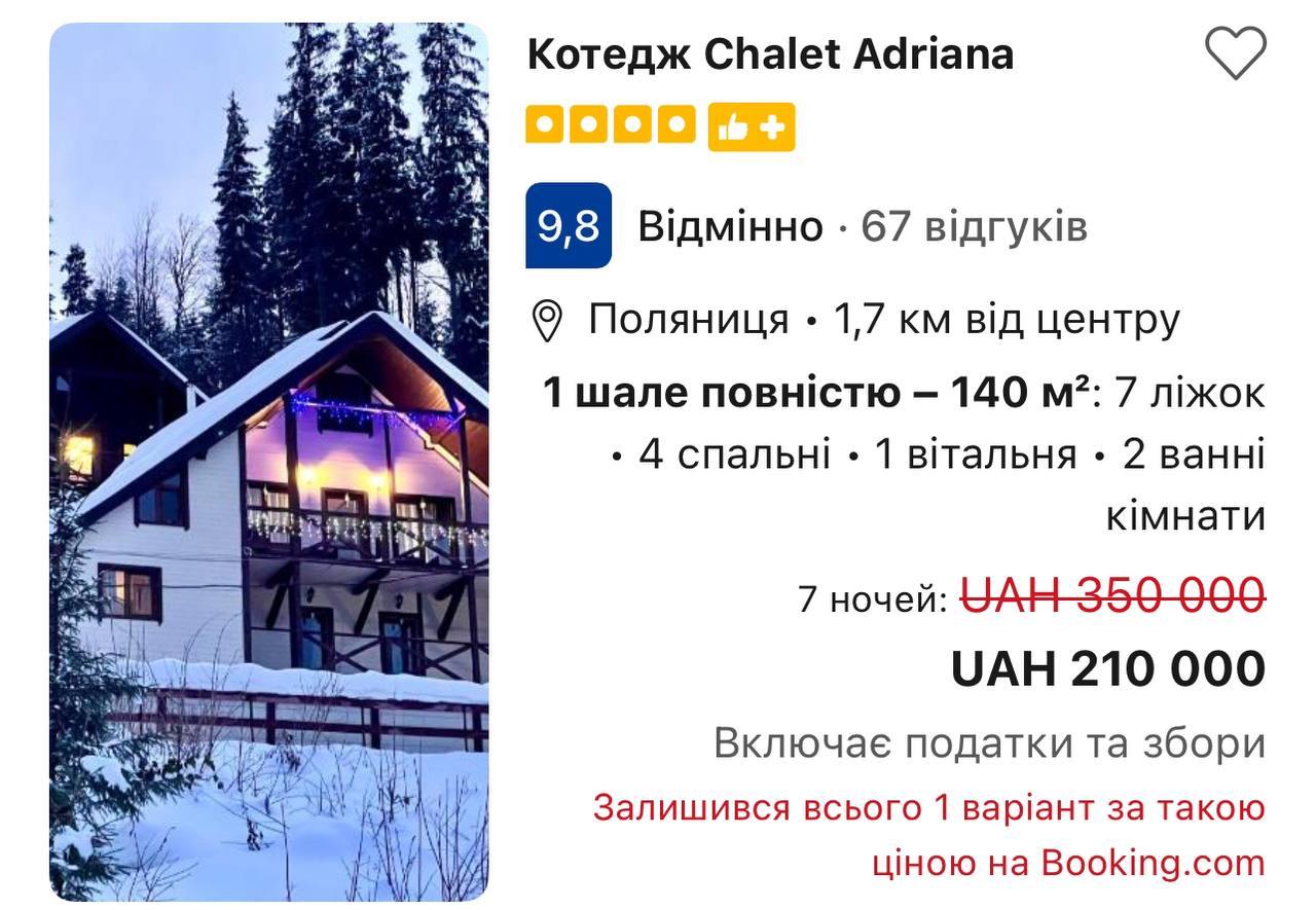 Аренда шале не дешевле гостиниц. Например, шале Chalet Adriana обойдется в 350 000 гривен за 7 ночей без скидки и 210 000 гривен со скидкой.