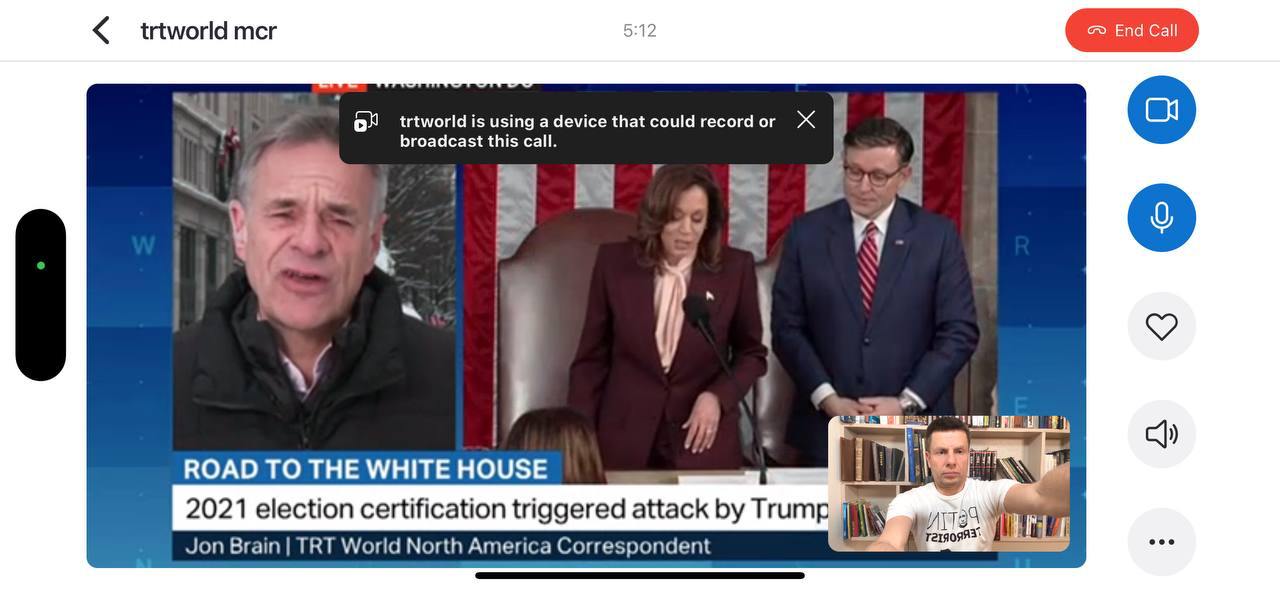 Украинского народного депутата из партии "Европейская солидарность" Алексея Гончаренко не пустили в эфир турецкого государственного телеканала TRT World из-за футболки, на которой было написано "Путин – террорист" и портретом президента РФ.