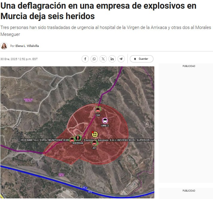 В испанском регионе Мурсия произошел взрыв на военном заводе компании Rheinmetall Expal Munitions, которая специализируется на производстве артиллерийских боеприпасов, минометных снарядов и снарядов среднего калибра, а также ракетных силовых установок.