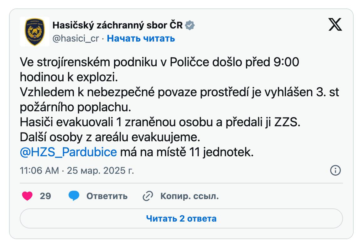 "Я могу подтвердить, что произошел взрыв. Была объявлена пожарная тревога третьего уровня", — сообщила пресс-секретарь пожарной охраны города Вендула Горакова.