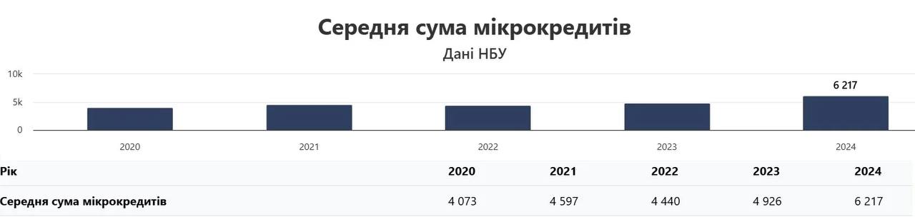 Средняя сумма микрокредита также выросла за год - на 27%. Если в 2023, в среднем, занимали 4 926 грн, то в прошлом году средний заем уже был на уровне 6 217 грн.