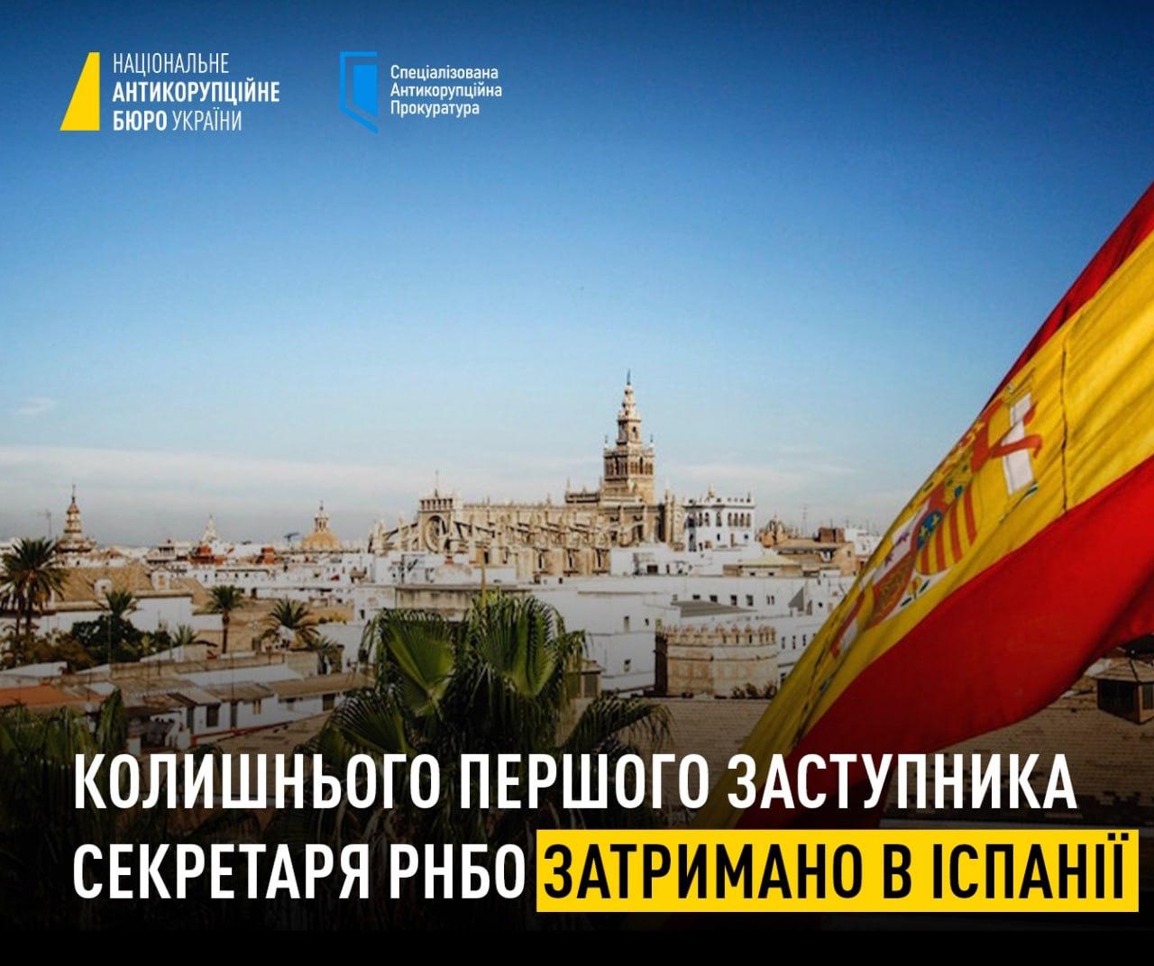 В Испании задержан бывший первый заместитель секретаря Совета национальной безопасности и обороны Украины (СНБО), сообщает НАБУ.