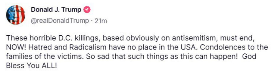 "Эти ужасные убийства в Вашингтоне, очевидно, на почве антисемитизма должны прекратиться, НЕМЕДЛЕННО! Ненависти и радикализма нет места в США. Соболезнования семьям погибших. Так грустно, что такие вещи могут происходить! Пусть Бог благословит Вас всех!", - написал он.