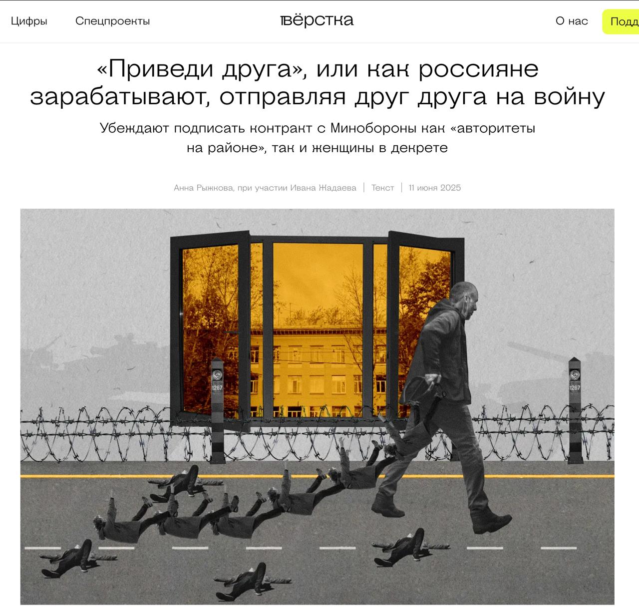 "За три года войны вербовка россиян на фронт превратилась в живой рынок, где за одним подписанным контрактом может стоять заказчик и исполнитель. Тысячи мужчин, уходя воевать, закрывают собой KPI (ключевые показатели эффективности - Ред.) региональных и городских ведомств и предприятий - и часто не задумываются об этом. Листая посты в телеграм-каналах или обсуждая с соседями повышение выплат на "СВО", мужчина может не знать, что за него как за клиента прямо сейчас конкурируют "вербовщики". Это могут быть бывшие HR-менеджеры, которые начали сотрудничать с военкоматами через посредников. Могут быть мамы в декрете, которые научились верстать яркие рекламные объявления и размещать их в социальных сетях. Или просто люди с широким кругом знакомств и талантом убеждения", - пишет издание.