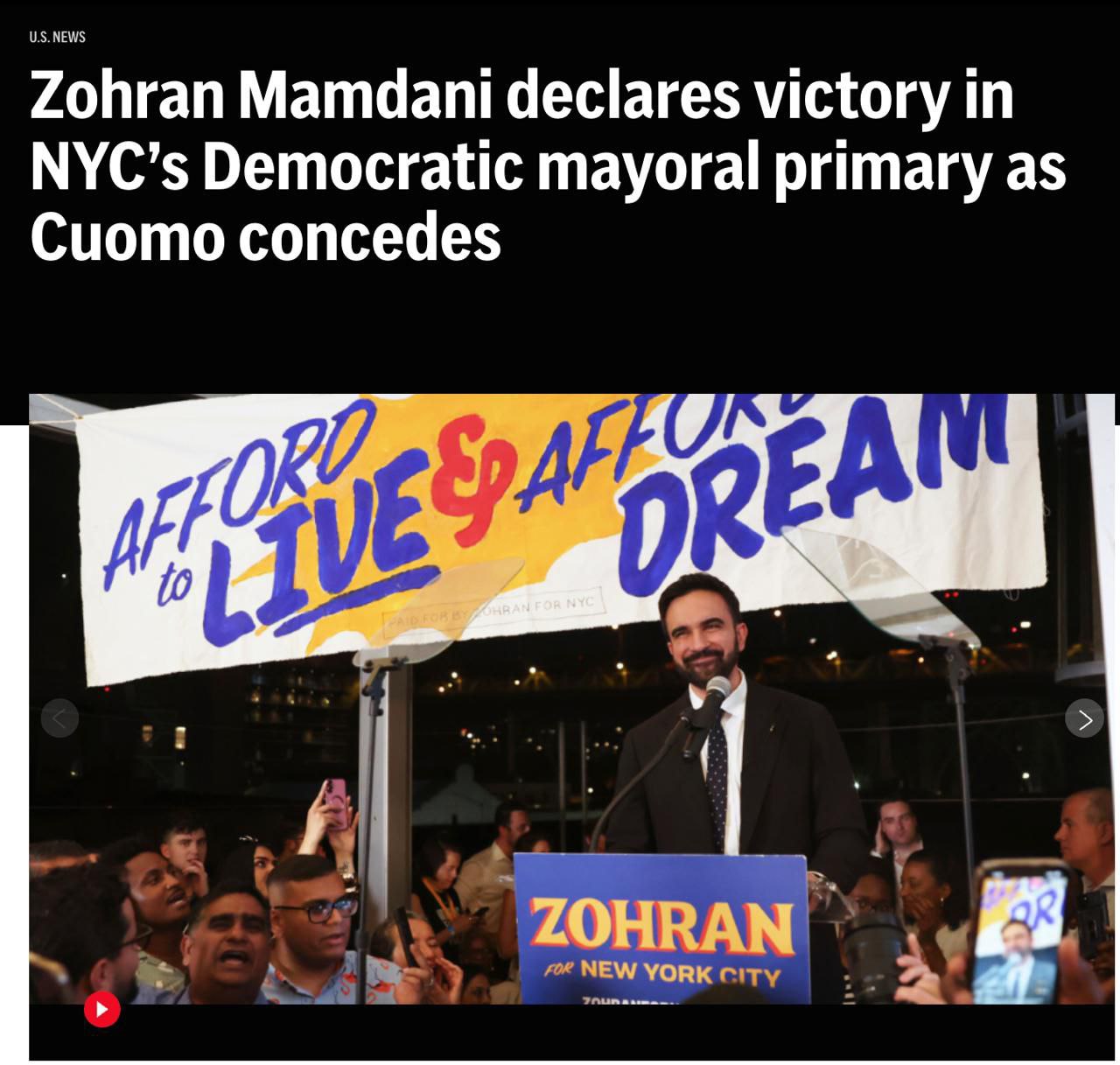 "Он был практически неизвестен в начале конкурса, создал значительный отрыв от более опытного, но попавшего в скандалы бывшего губернатора Эндрю Куомо", - говорится в статье.