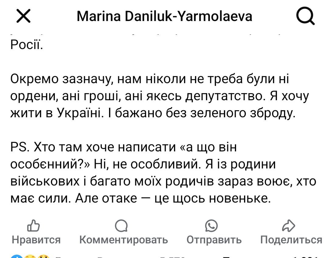 "В последние годы он внештатно выполнял проекты для ГУР на территории врага. Причем очень успешно – возможно, сейчас проекту будет конец, но я точно знаю, что он отдавал ему всю душу и умение", - пишет девушка.