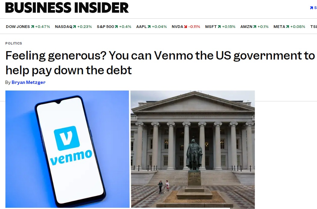 Министерство финансов США запустило прием пожертвований от рядовых американцев на погашение госдолга страны, который к сегодняшнему дню составляет 36,72 триллиона долларов. Донаты принимаются через платформу мобильных платежей Venmo.