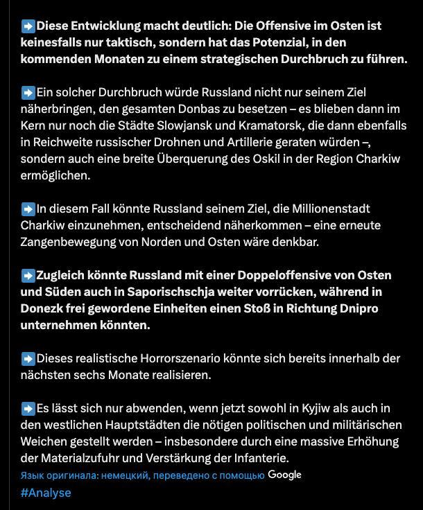 "Это развитие событий ясно показывает: наступление на востоке ни в коем случае не является просто тактическим, но имеет потенциал привести к стратегическому прорыву в ближайшие месяцы", - добавил Репке.
