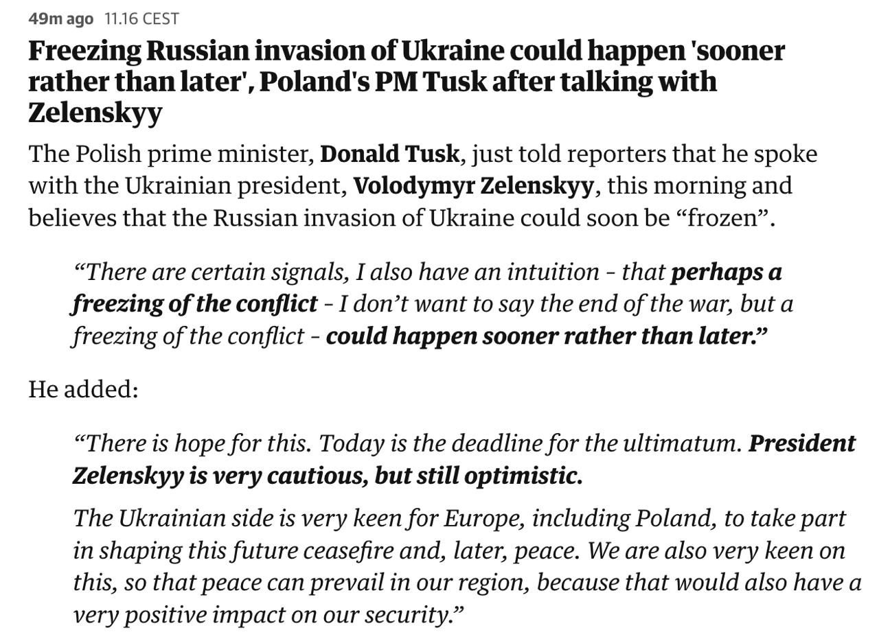"Есть определенные сигналы, у меня также есть интуиция, что, возможно, замораживание конфликта - я не хочу говорить о конце войны, но о замораживании конфликта - может произойти скорее раньше, чем позже. Есть надежда на это. Сегодня истекает срок ультиматума. Президент Зеленский очень осторожен, но все же оптимистичен", - сказал Туск.