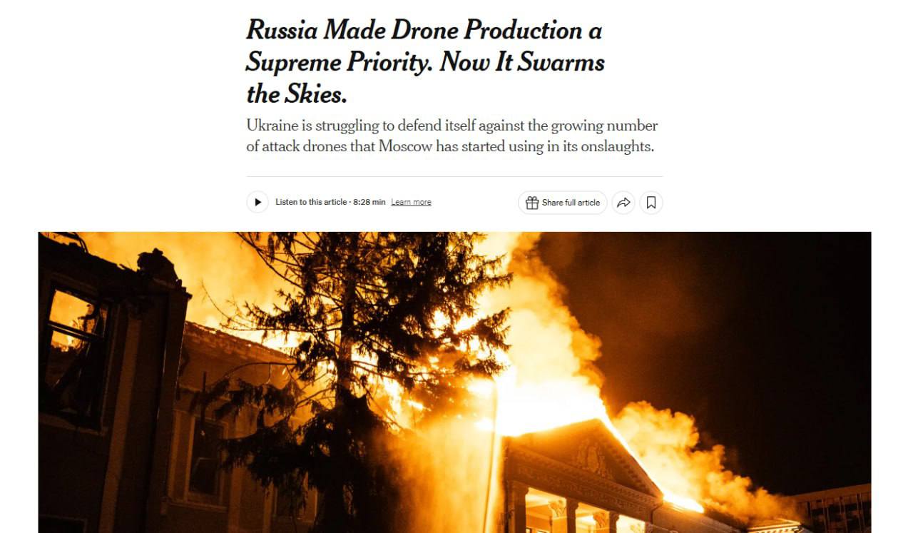 Об этом говорится в статье The New York Times, посвященной проблеме беспилотников, атакующих Украину. Издание приводит данные, по которым в 2025 году было применено более 34.000 ударных беспилотников и дронов-ловушек.