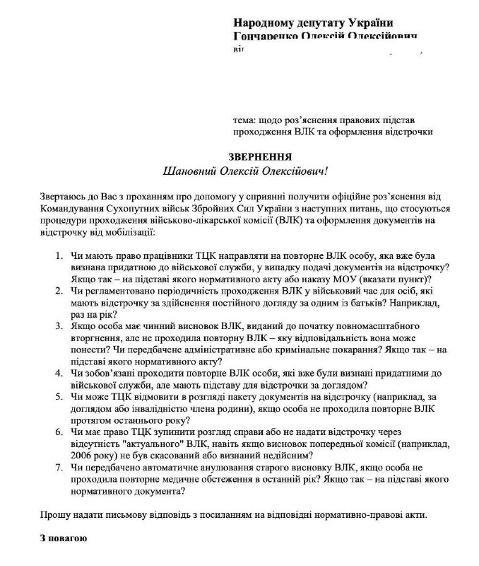 "Главное из этого ответа: если уже признали пригодным без ограничений, проходить ВВК ежегодно не нужно. Старая ВВК не аннулируется автоматически. Отказать в отсрочке из-за несвежего ВВК не имеют права. Ответственности за непрохождение ВВК раз в год законом нет. Повторно направляют на ВВК только тех, кого сочли ограниченно или временно непригодными. Вывод прост: требования ТЦК делать новый ВВК каждый год – это злоупотребление. Закон этого не требует", - пишет Гончаренко.