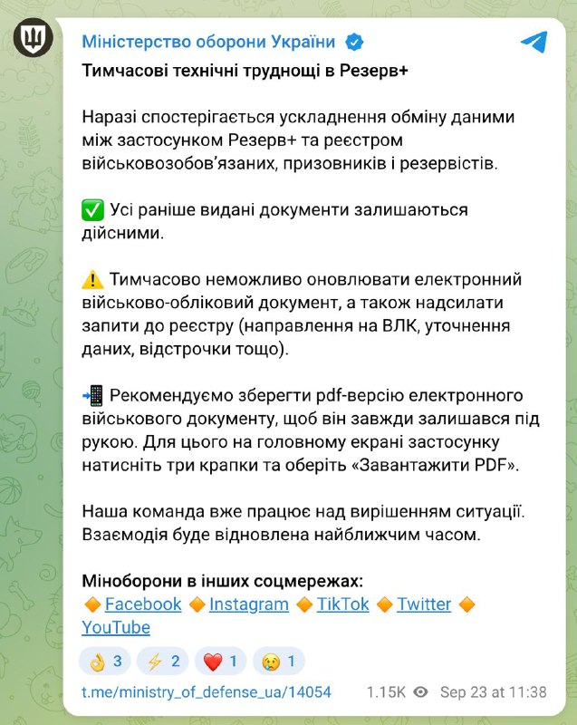 "Временно невозможно обновлять электронный военно-учетный документ, а также отправлять запросы в реестр (направление на ВВК, уточнение данных, отсрочки и т.п.). Рекомендуем сохранить pdf-версию электронного военного документа, чтобы он всегда оставался под рукой", - пишет ведомство.