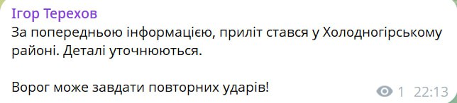 22.15 В Харькове прилет в Холодногорском районе, сообщил мэр Терехов.