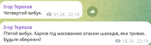 22.12 Взрыв в Харькове, сообщил мэр Терехов.