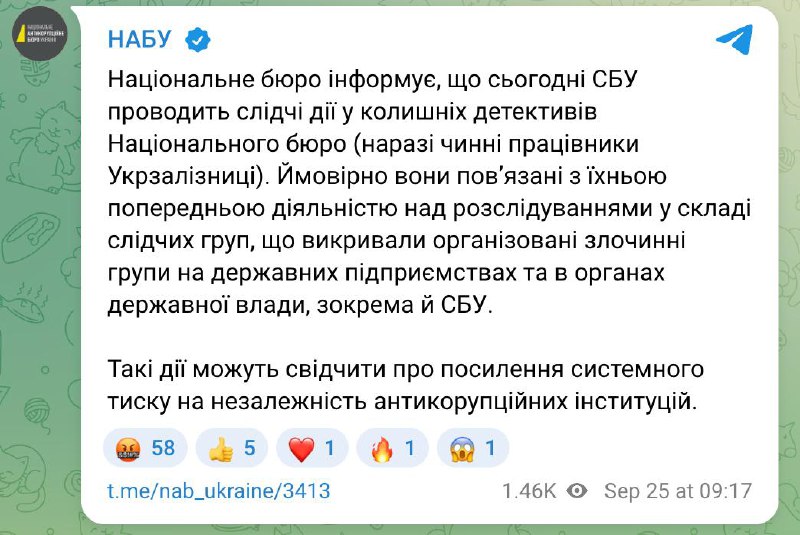 "Национальное бюро информирует, что сегодня СБУ проводит следственные действия у бывших детективов Национального бюро (в настоящее время действующие работники "Укрзализныци"). Вероятно, они связаны с их предыдущей деятельностью над расследованиями в составе следственных групп, разоблачающих организованные преступные группы на государственных предприятиях и в органах государственной власти, в том числе и СБУ. Такие действия могут свидетельствовать об усилении системного давления на независимость антикоррупционных институтов", - считают в НАБУ.