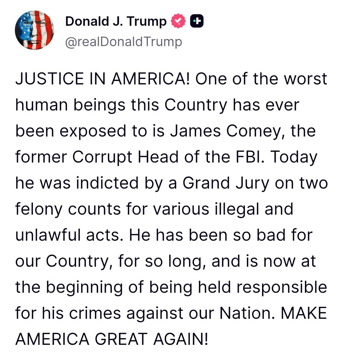 Комментируя обвинения, Трамп написал в своей соцсети Truth Social: "Один из худших людей, с которыми когда-либо сталкивалась эта страна, - это Джеймс Коми. Он так долго причинял вред нашей стране, и теперь наконец-то пришло время, когда он будет привлечен к ответственности".