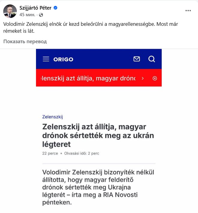 К посту он приложил скриншот венгерского сайта Origo с новостью о том, что Зеленский рассказал об обнаружении дронов-разведчиков на украинско-венгерской границе.
