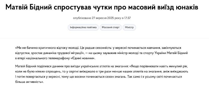 Между тем министр молодежи и спорта Матвей Бедный отрицает массовый выезд молодежи из Украины.