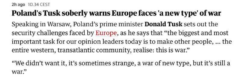Между тем польский премьер-министр Дональд Туск уверен, что Европа уже находится в состоянии войны. Как передает The Guardian, Туск назвал происходящее "новым типом" войны.