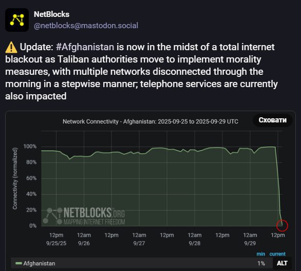 Кроме того, по данным NetBlocks, в Афганистане также нарушена работа телефонной связи.