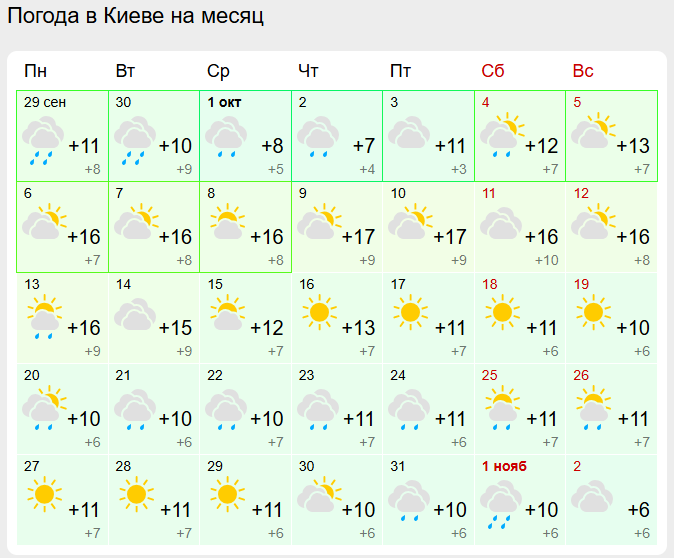 Согласно прогнозу погоды в Киеве, с 1 по 9 октября температура днем будет колебаться от +7 до +17, ночные температуры - от +3 до +9.