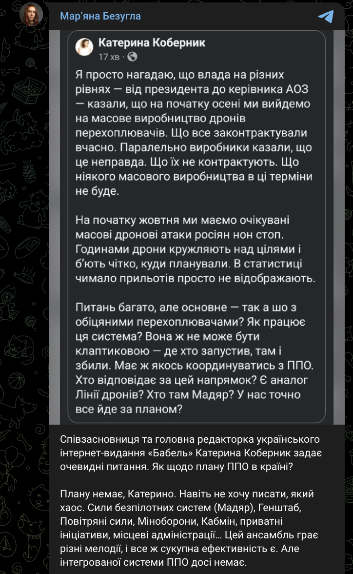 Вопросов много, но главный — так а что с обещанными перехватчиками? Как работает эта система? Она же не может быть лоскутной — где кто запустил, там и сбили. Должна же как-то координироваться с ПВО. Кто отвечает за это направление? Есть аналог Линии дронов? Кто там Мадяр? У нас точно все идет по плану?" - пишет Коберник.