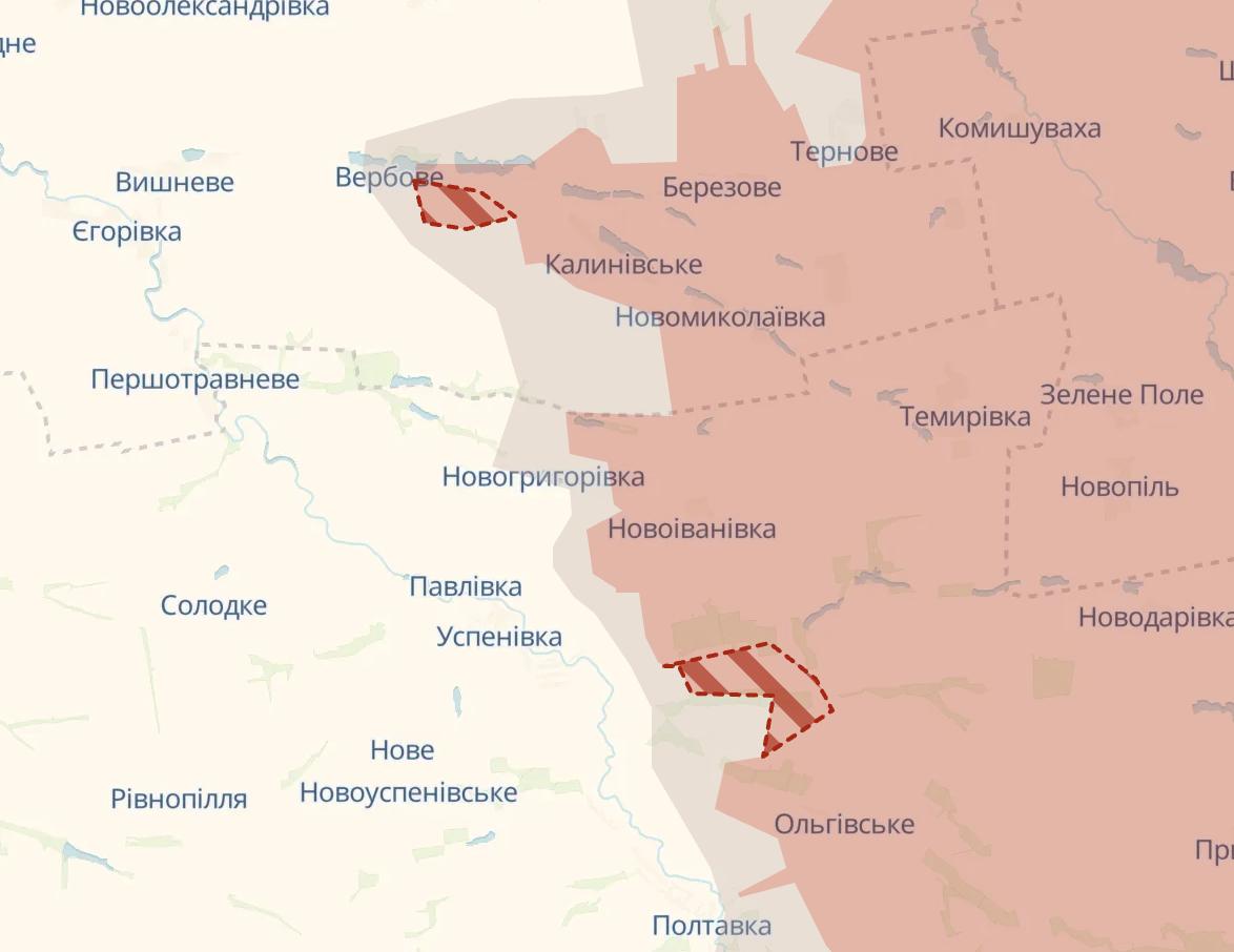 "Противник, захватив Вербовое, возобновил движение дальше — сейчас их основной ход идёт западнее по узкому коридору вдоль лесополосы в направлении Вишневого. Тактика та же, что и на Вербовом: быстрые выталкивания вперёд небольшими подразделениями с прикрытием огнём, поиск слабых участков в нашей обороне и попытки закрепиться в посадках и углублениях", - пишет украинский боец с позывным "Мучной".