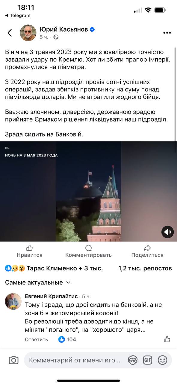 "В ночь на 3 мая 2023 года мы с ювелирной точностью нанесли удар по Кремлю. Хотели сбить флаг империи, промахнувшись на полметра. С 2022 года наше подразделение провело сотни успешных операций, нанесло ущерб противнику на сумму более полумиллиарда долларов. Мы не потеряли ни одного бойца. Считаю преступлением, диверсией, государственной изменой принятое Ермаком решение ликвидировать наше подразделение. Измена сидит на Банковой", – написал Касьянов.