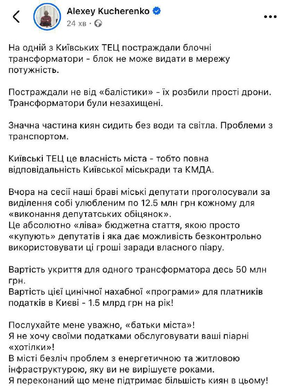 12:21 На одной из Киевских ТЭЦ после обстрела пострадали блочные трансформаторы, которые были не защищены, заявляет нардеп Кучеренко.