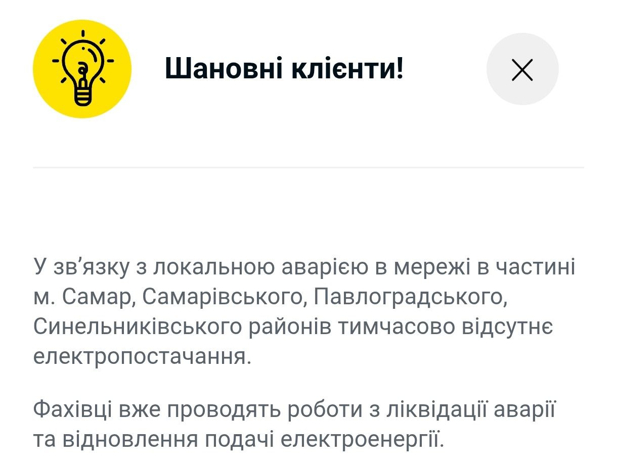 08:34 В части города Самар в Днепропетровской области, а также в Самаровском, Павлоградском и Синельниковском районах временно отсутствует электроснабжение из-за аварии в сети, сообщили в ДТЭК.