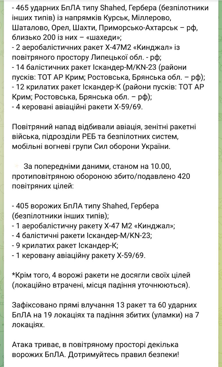 10:23 По Украине ночью запустили 497 воздушных целей, было 73 прилета, сообщают Воздушные силы.