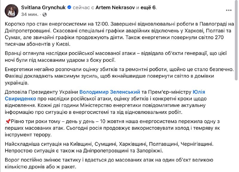 13:17 В Днепропетровской, Сумской и Харьковской областях удалось улучшить ситуацию со светом, но в целом отключения продолжаются в 10 регионах, как и было утром, сообщает Минэнерго.