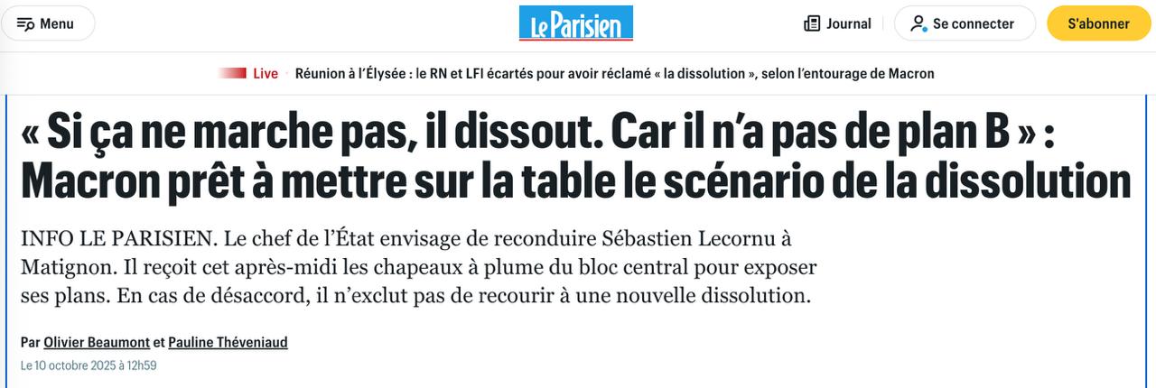 "В таком случае Эммануэль Макрон готов выложить карты на стол: по нашей информации, он прибегнет к сценарию нового роспуска парламента. "Если это не сработает, он распустит парламент. Потому что у него нет плана Б", — отмечает один из его близких соратников. Это будет последний штрих давления в виде президентского покера. Все или ничего... в последнюю минуту безумной недели", - пишет газета.