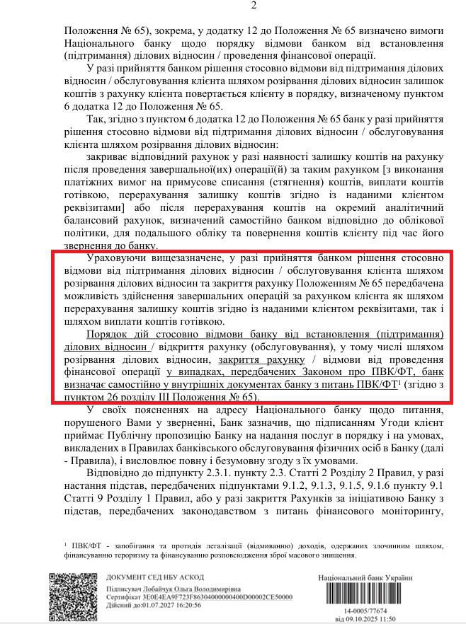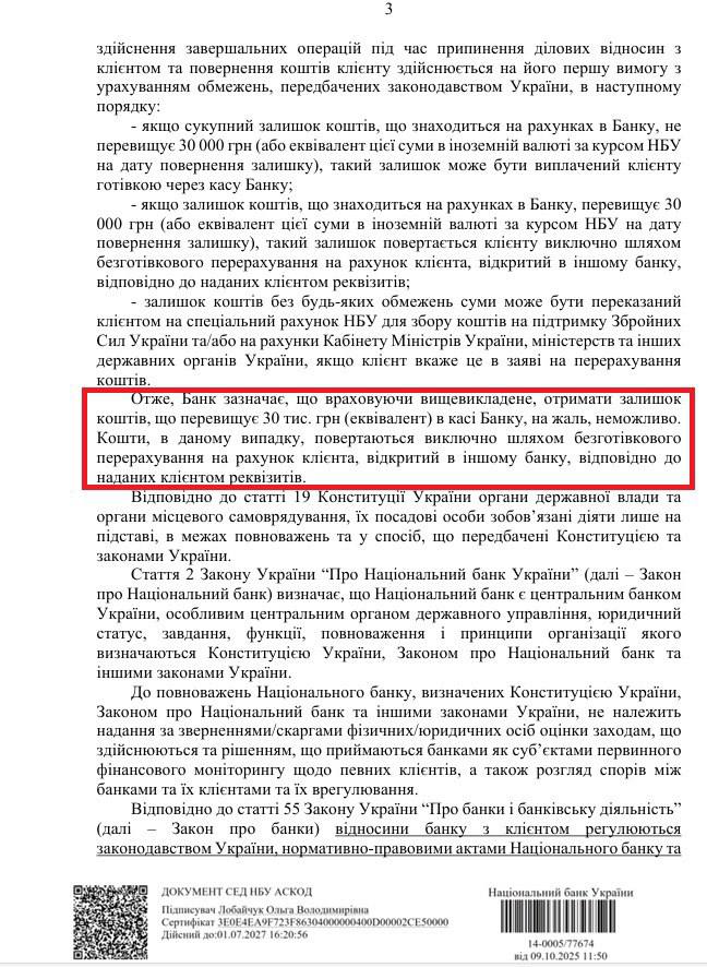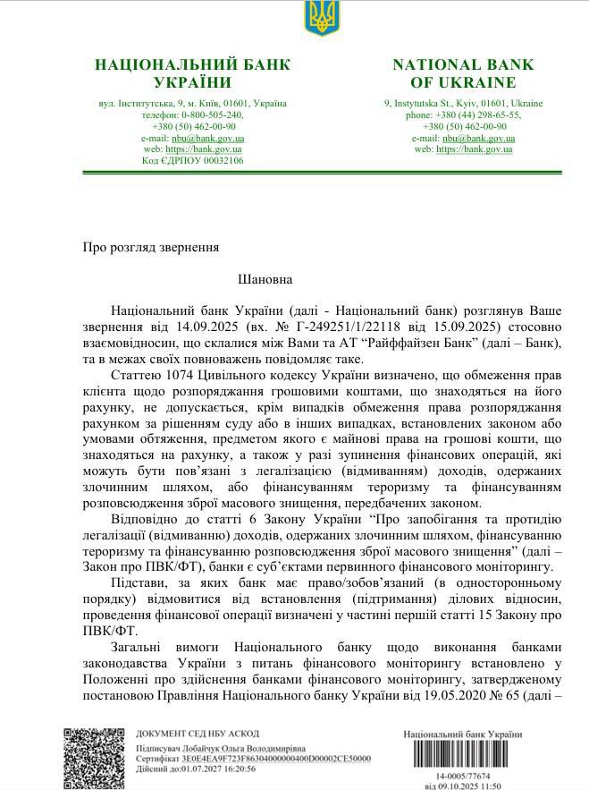Эту позицию НБУ расписал в своем письме №14-0005/77/674 от 9 октября 2025 года, которое оказалось в распоряжении "Страны".