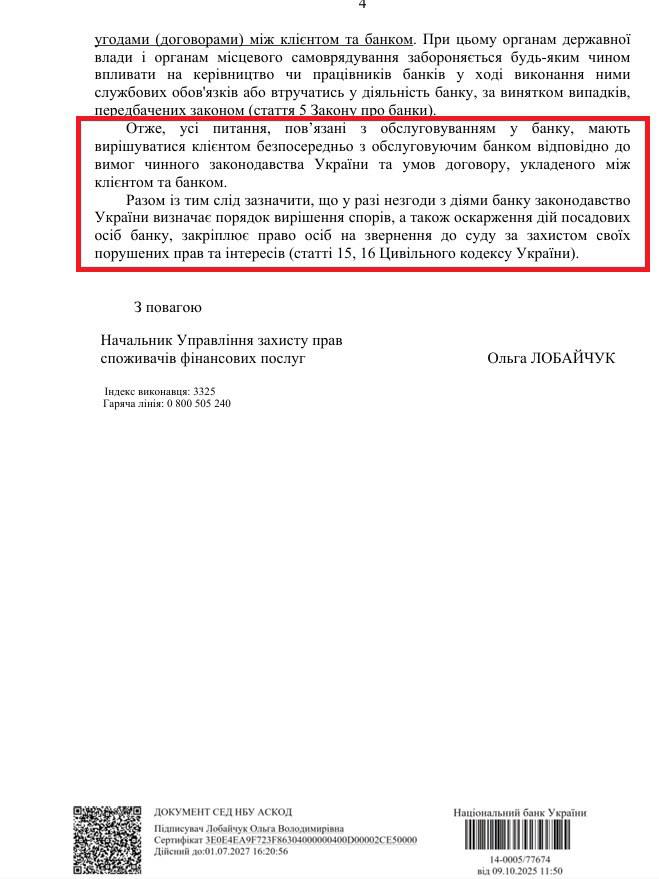 "Все вопросы, связанные с обслуживанием в банке, должны решаться клиентом непосредственно с обслуживающим банков, в соответствии с требованиями действующего законодательства Украины и условий договора, заключенного между клиентом и банком. В случае несогласия с действиями банка законодательство Украины определяет порядок решения споров, а также оспаривания действий должностных лиц банка, закрепляет право лиц на обращение в суд за защитой своих нарушенных прав и интересов", - говорится в письме Нацбанка.