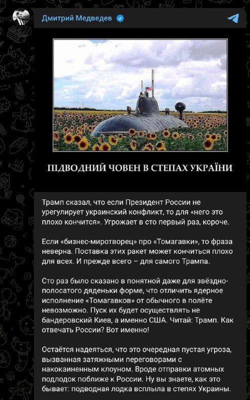"Сто раз было сказано в понятной даже для звёздно-полосатого дяденьки форме, что отличить ядерное исполнение "Томагавков" от обычного в полёте невозможно. Пуск их будет осуществлять не Киев, а именно США. Читай: Трамп. Как отвечать России? Вот именно!" - пишет зампред Совбеза РФ.