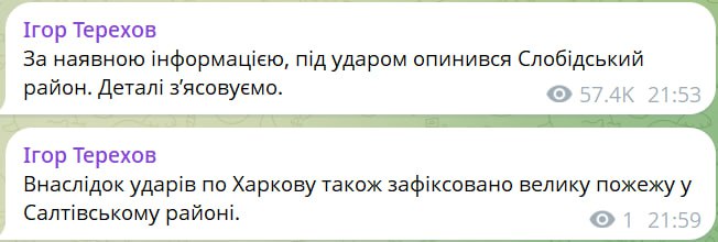 21.54 В Харькове прилеты КАБ, сообщил мэр Терехов.