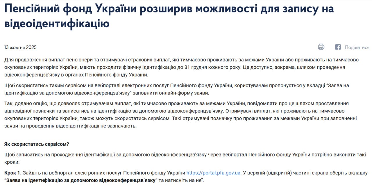 Пенсионный фонд Украины (ПФУ) добавил возможность онлайн-записи на видеоидентификацию, которую пенсионеры, проживающие на оккупированных территориях или за границей, должны пройти до 31 декабря 2025 года. Это необходимо для сохранения выплат.